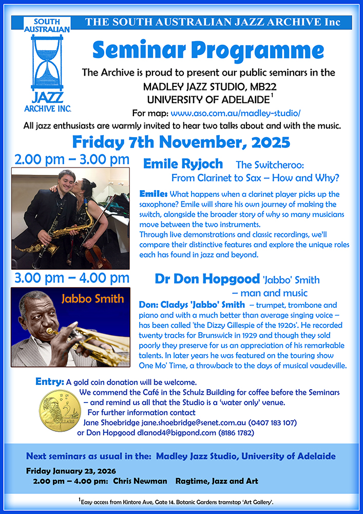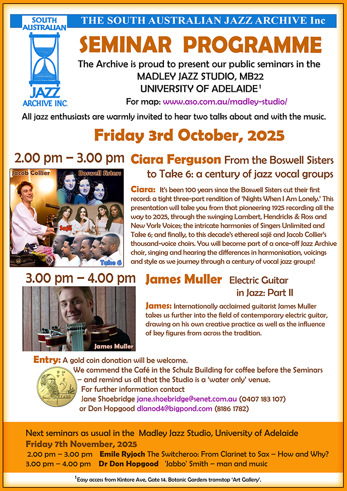 THE SOUTH AUSTRALIAN JAZZ ARCHIVE Inc proudly announces twin seminars: